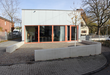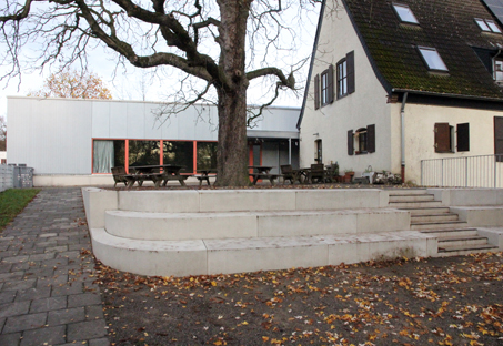 Das an den Rheinauen gelegene Jugendhaus, einer der wichtigen Standorte des Vereins, wird um einen Pavillon für tagestrukturierende, inklusive Angebote für ältere Menschen erweitert. Dadurch bietet sich die Möglichkeit, die Flächen um die Gebäude und den Eingangsbereich barrierefrei zu gestalten. Zwei Stützwänden strukturieren die Freiräume. Ein Thema des Ortes - der Hochwasserschutz mit der großen Sperrwand - wird neu interpretiert.
