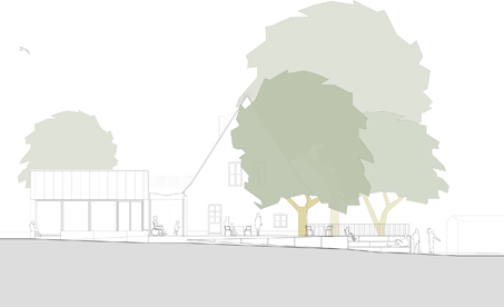 Das an den Rheinauen gelegene Jugendhaus, einer der wichtigen Standorte des Vereins, wird um einen Pavillon für tagestrukturierende, inklusive Angebote für ältere Menschen erweitert. Dadurch bietet sich die Möglichkeit, die Flächen um die Gebäude und den Eingangsbereich barrierefrei zu gestalten. Zwei Stützwänden strukturieren die Freiräume. Ein Thema des Ortes - der Hochwasserschutz mit der großen Sperrwand - wird neu interpretiert.