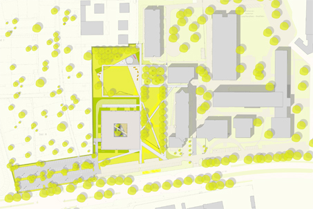 Ausgehend von der Logik der bestehenden Freianlagen ist ein Rundweg geplant, der „umspielt“ ist von Flächen mit unterschiedlichen Charakter. In Erweiterung des Baumhains entsteht ein Grillplatz, daran anschließend eine Platzfläche für das Veranstaltungszelt des Zendomes mit umliegenden Spielflächen für Kinder insbesondere während der Ferienbetreuung und unterschiedliche Orte zum Sitzen und Liegen.