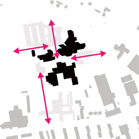 Die zentrale Lage legt in Verbindung mit der leistungsstarken Infrastruktur der bestehenden Verkehrsachsen und der Zielsetzung nachhaltiger Stadtplanung ein hohes Maß an Urbanität und Dichte nahe. Dichte ist hier aus mehreren Gründen geradezu erforderlich: Sie ist wirtschaftlich in Bau und Betrieb, minimiert den Energiebedarf, stellt einen baulichen Lärmschutz gegenüber der Feuerwehr und den großen Straßen her und bildet eine urbane Identität aus, die über die rein architektonische Identität von Hochschulbauten hinausgeht.